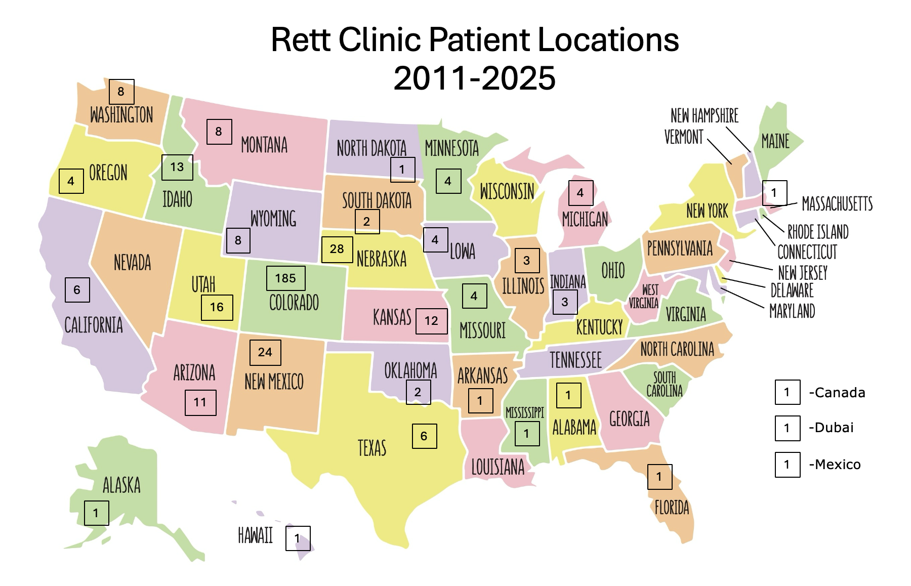 Patients are coming from all over the US! Check out the US map with the number of patients who are traveling to the Rett Clinic at Children’s Hospital Colorado from all over the US.