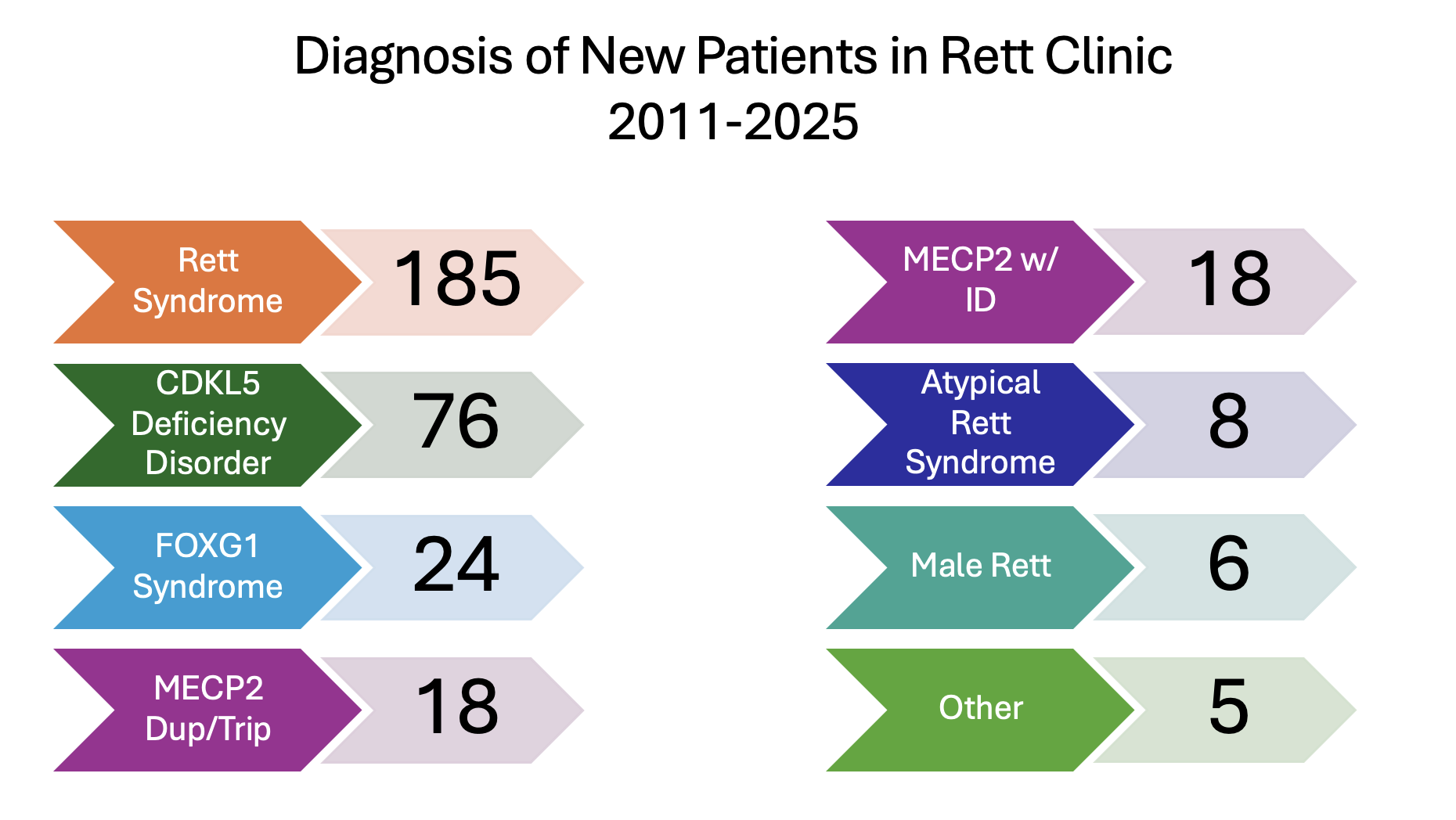 The Clinic will serve all patients with a positive genetic test for Rett Syndrome (Typical, Atypical, Male) and Rett-related disorders, such as CDKL5 Deficiency Disorder, FOXG1 Syndrome, MECP2 variance, and will not discriminate on the basis of age, sex or any other objective factor. We see patients for their entire life through our Rett Clinic Program.